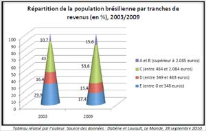La grande marque de l’ère Lula aura été un retour en force de l’interventionnisme étatique, avec une réorientation des politiques gouvernementales vers les populations déshéritées. Paradoxalement les choix de politique économique ont conforté l’accumulation croissante de capital par les élites économiques. Les ministres de l’Économie (Antonio Palocci, 2003-2006, Guido Mantega, 2006-2010) et le président de la Banque du Brésil (Henrique Meirelles, 2003-2010) ont poursuivi – et même approfondi – la politique économique orthodoxe de l’ère Cardoso. Ainsi, le contrôle de l’inflation s’est appuyé sur le maintien de taux d’intérêts très élevés (supérieurs à 10 %), faisant la richesse des investisseurs financiers nationaux (et internationaux). Les grandes entreprises de l’agro-business ont également pu bénéficier de politiques visant à stimuler les exportations de produits brésiliens. Si des millions de personnes ont vu leur revenu augmenter de quelques dizaines d’euros, plusieurs milliers de nantis en ont amassé des millions. Entre 2007 et 2008, le nombre de millionnaires est passé de 131 000 à 143 000 [5]. Lula confessa lui-même lors d’un discours prononcé dans l’État de Minas Gerais : « les riches sont ceux qui ont gagné le plus d’argent sous mon gouvernement » [6]. Ceci contribue à expliquer pourquoi Lula est tout aussi populaire dans les secteurs les plus aisés que chez les populations pauvres. Les 10 % les plus riches concentrent toujours 50 % des revenus. Entre 2001 et 2009, leurs revenus individuels ont même augmenté de 1,49 % en moyenne [7]. Cette tendance s’est toutefois inversée en 2008 et 2009, en raison de la crise économique internationale (une baisse de 7 % entre 2007 et 2008, puis de 8,7 % entre 2008 et 2009) [8]. Comme l’illustre le graphique ci-dessus, le Brésil compte également de plus en plus de riches. La part des catégories les plus aisées (A et B) est passée de 10,7 à 15,6 % entre 2003 et 2009.