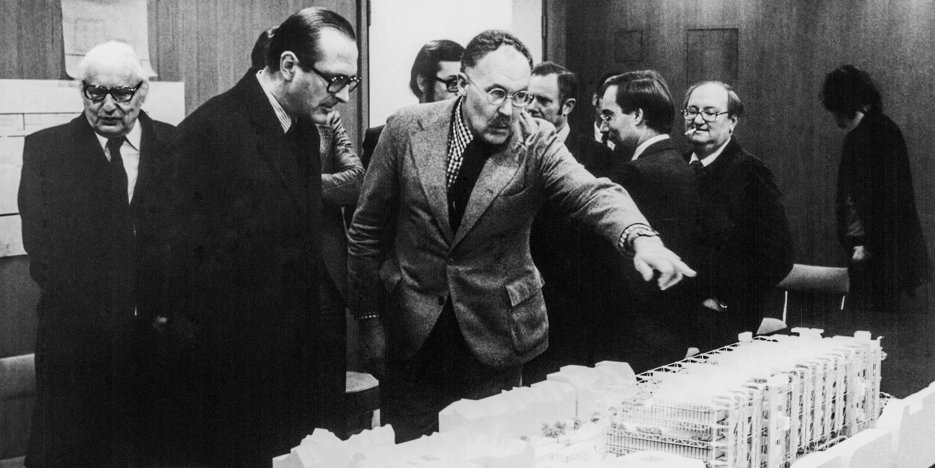 Pontus Hultén présentant la maquette du Centre Pompidou au premier ministre Jacques Chirac (vers 1974-1976)