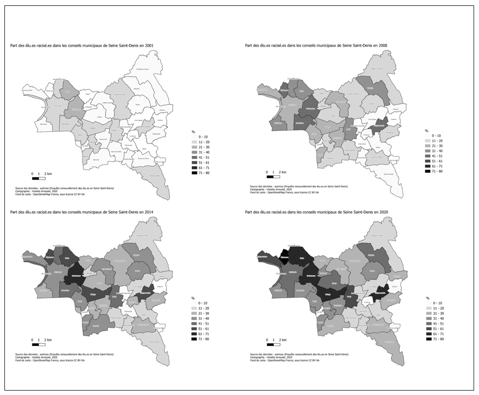 Figure 2. Part des élu·es racisés dans les conseils municipaux après les élections de 2001, 2008, 2014 et 2020