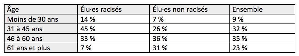 Tableau 2. Âge des élu·es racisés et non racisés des conseils municipaux (en %) en 2000