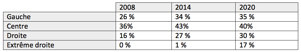 Mais si l’analyse prend en compte une structuration du champ politique en quatre blocs – gauche (PCF, PS, Écologistes, extrême gauche et Divers gauche), central (MODEM, UDI, LREM), droite (LR, divers droite), et extrême droite –, dont les périmètres restent discutables, des différences significatives apparaissent. Le centre, plus que la gauche, représente un véhicule pour des candidatures venant des minorités visibles. Ce résultat renvoie sans doute pour partie aux stratégies d’implantation de l’UDI, qui se sont appuyées sur des alliances avec des militant·es associatifs racisés [22]. La droite, bien qu’ayant contribué au niveau national à imposer la thématique de la diversité, reste en deçà des moyennes départementales. L’extrême droite quant à elle, très peu présente dans le département au niveau local, demeure particulièrement en retrait, mais avec une percée notable en 2020.