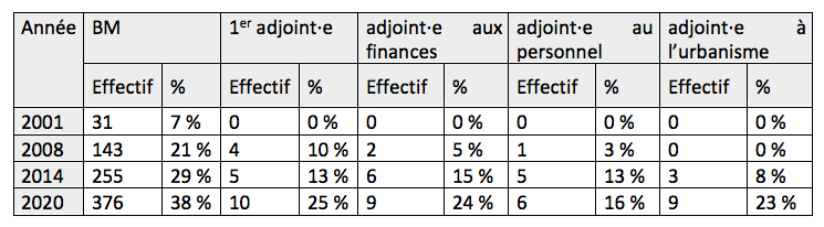 [20] La part des femmes parmi les candidat·es des minorités visibles est légèrement inférieure à celle des femmes parmi les candidat·es en général en 2001 et 2008 mais elle s’aligne à partir de 2014. La parité hommes/femmes dans les bureaux municipaux est respectée dès 2001, avec une surreprésentation des femmes en 2001 et 2008, qui tend à s’amenuiser dans les mandats suivants. Ainsi en 2001, les femmes représentent 34,1 % des membres des bureaux municipaux alors que celles appartenant aux minorités visibles y représentent 53,6 % des élu·es minorités visibles. Cet écart, qui peut s’expliquer par le faible nombre d’individus concernés en 2001, s’atténue dès 2008 pour devenir marginal en 2020.