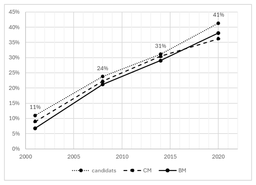 De la candidature à l’élection au conseil municipal et à la participation à l’exécutif (bureau municipal), la représentation des minorités visibles évolue de façon quasi parallèle. Leur présence dans les conseils municipaux n’est que très légèrement inférieure à celle dans les listes de candidatures (de l’ordre de 2 à 3 %). La part des élu·es racisés dans les bureaux municipaux suit la même courbe : entre 2001 et 2020, elle rattrape et dépasse même leur représentation dans les conseils municipaux.