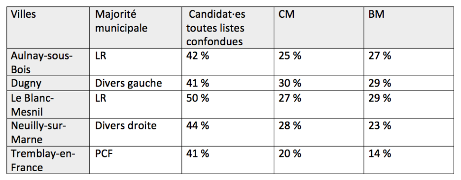 Ces décalages résultent principalement du fait que, pour ces villes, les minorités visibles sont plus présentes dans des listes qui n’arrivent pas en tête des scrutins et qui se situent donc dans l’opposition municipale. Au Blanc-Mesnil par exemple, en 2020, la liste majoritaire LR compte au premier tour 17 % de candidat·es racisés, alors que les différentes listes de gauche en comptent respectivement 78 % (DG), 51 % (PCF) et 53 % (LO). À Tremblay-en-France, la liste d’Union de la gauche majoritaire, conduite par un maire communiste, compte 24 % de candidat·es minorités visibles pour 54 % dans la liste divers droite.