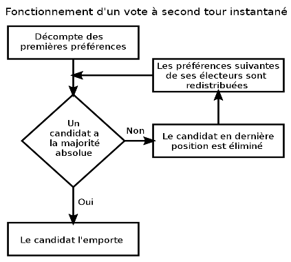 – La majorité : quand une majorité de votants a placé un candidat en premier choix de leur vote, celui-ci doit gagner l’élection.