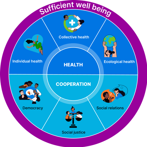 La coopération permet à toutes les dimensions du bien-être humain de s’épanouir ; la santé est placée au-dessus de la coopération, car elle perpétue l’espèce humaine et permet le partage de la vie avec les non-humains.