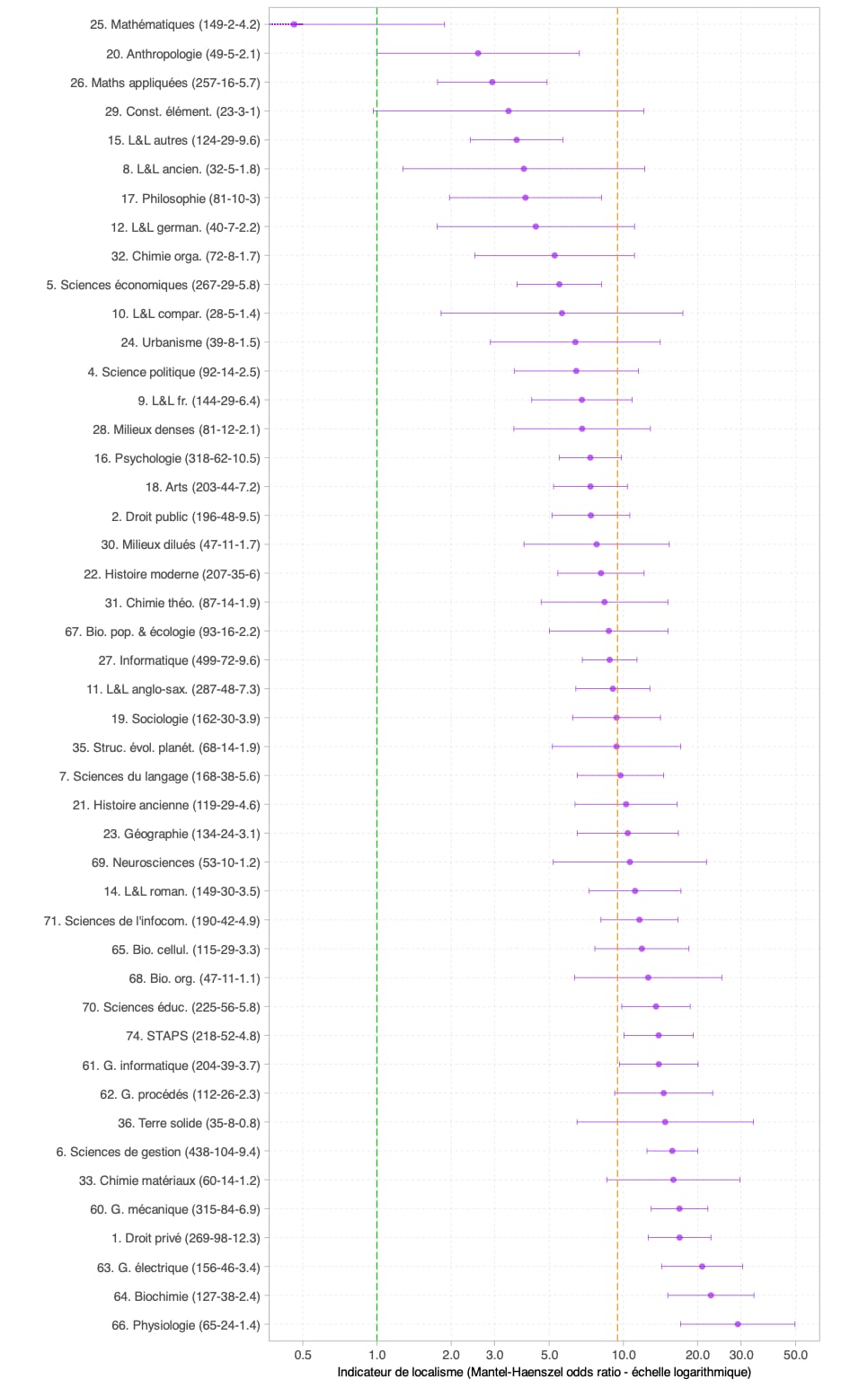 Dans quelle discipline ce phénomène est-il plus ou moins prononcé ? La figure 1 montre la variation de notre indicateur de localisme (le Mantel-Haenszel odds ratio, noté ci-après OR) par section disciplinaire du CNU. Celui-ci varie de 0,5 en mathématiques fondamentales à 29 en physiologie.