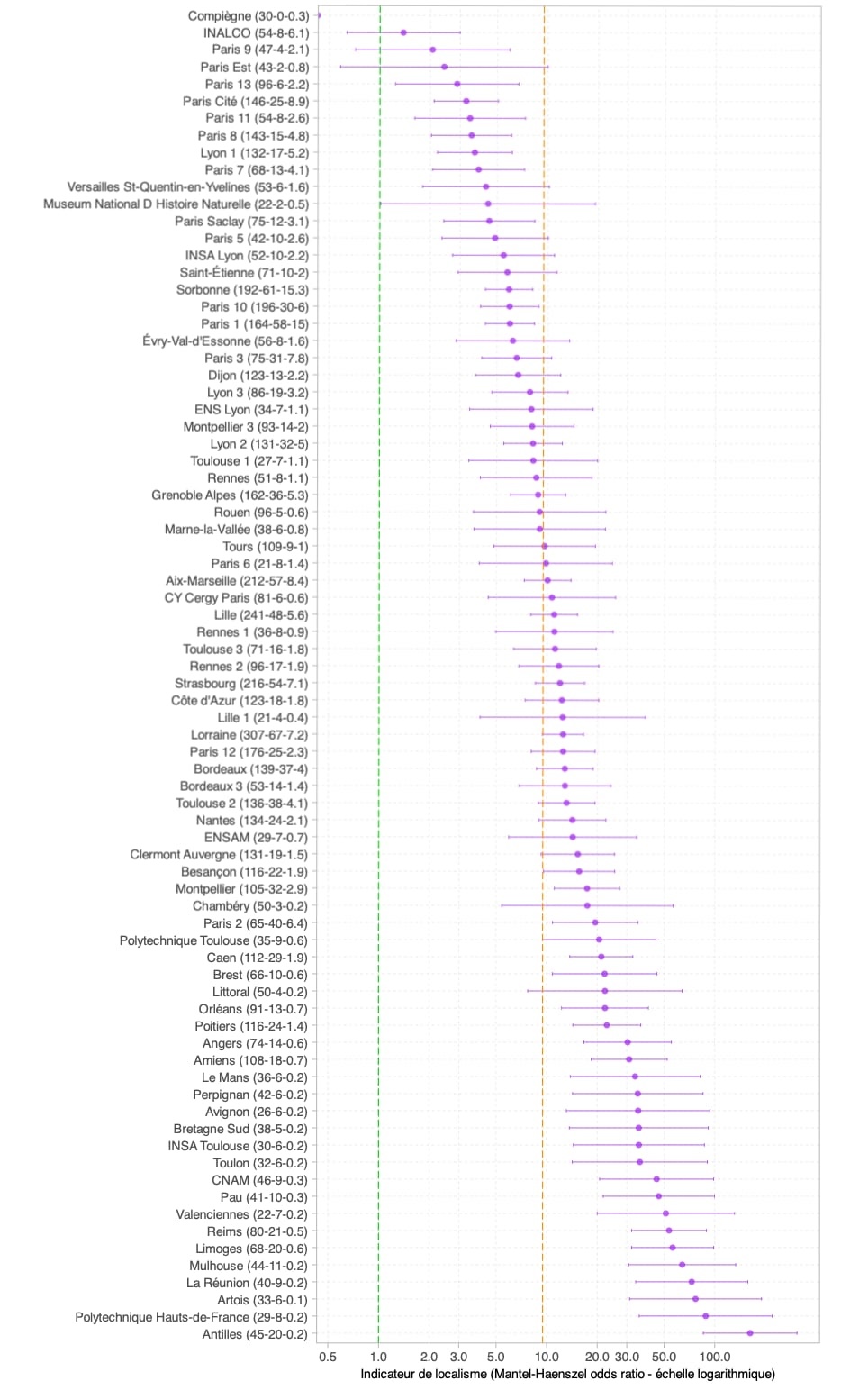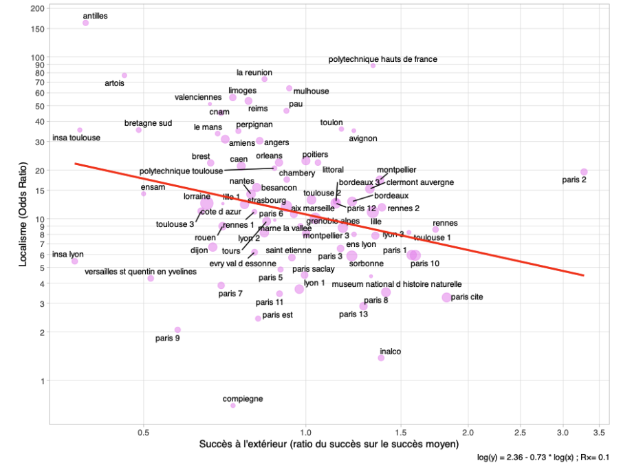 Le niveau très élevé de l’indicateur de localisme des universités d’outre-mer comme celles des Antilles (OR = 163) ou de La Réunion (OR = 58) (ainsi que celles de Polynésie, de Guyane et de Corse – non représentées en raison d’un faible nombre de recrutements) peut sans doute s’expliquer par une combinaison d’éloignement géographique, d’insularité et d’affirmations identitaires dans un contexte post-colonial parfois tendu [42]. Néanmoins, on remarquera que certaines universités de province comme Artois (OR = 77) ou Mulhouse (OR = 64) présentent des indicateurs de localisme plus élevés que celui de la Réunion, et ce malgré leur proximité avec les grands pôles universitaires de Lille, Paris ou Strasbourg.