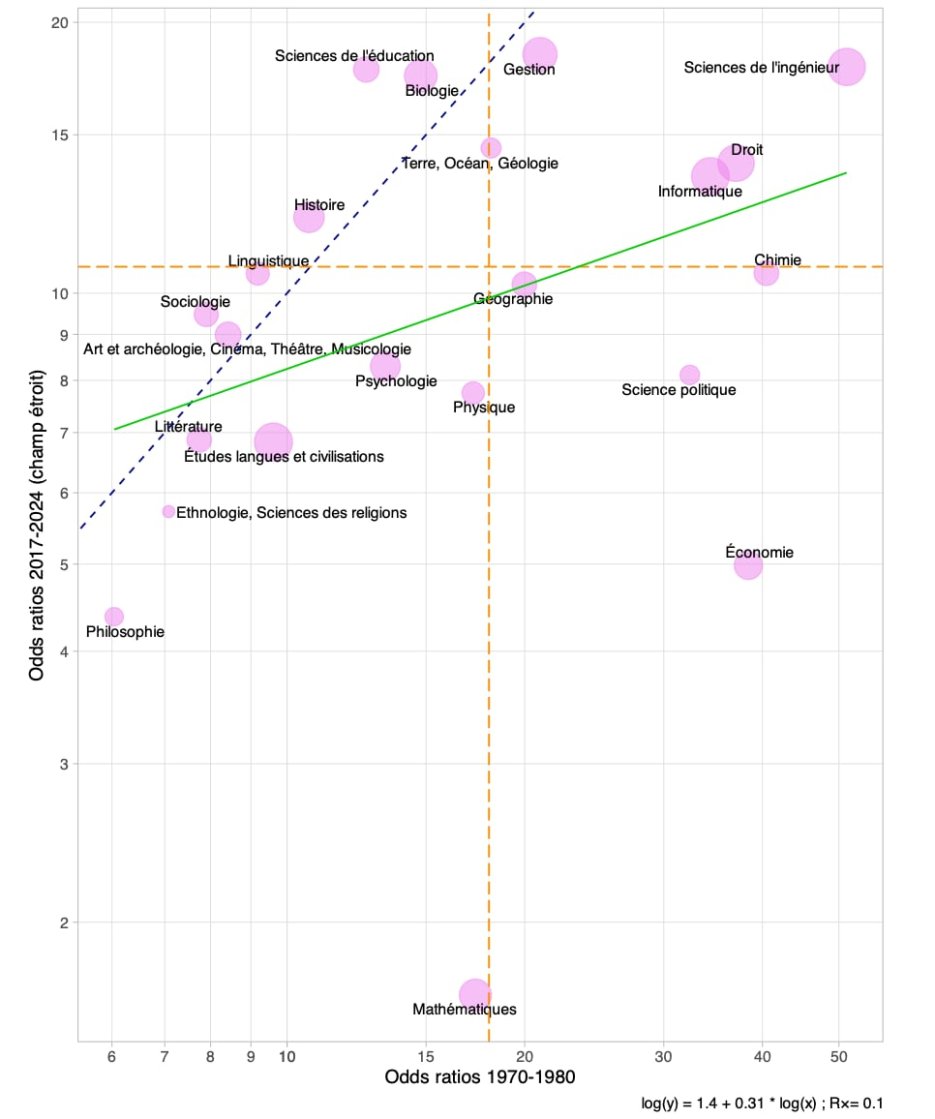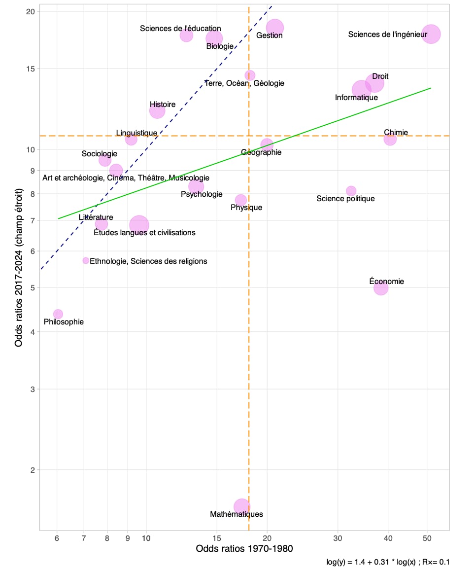 La figure 4 permet de pénétrer le détail disciplinaire de cette transformation en comparant les résultats de l’article de 2008 (qui permettait d’approcher le recrutement des années 1970 et 1980) et ceux établis sur la période récente. Sous l’hypothèse que les deux indicateurs sont à peu près comparables, on mesure une hausse modérée du localisme au sein de quelques disciplines (situées au-dessus de la ligne pointillée bleue), comme l’histoire, la sociologie, la biologie et, de manière plus prononcée, les sciences de l’éducation. Le localisme diminue en revanche dans la plupart de disciplines, et certaines connaissent une évolution particulièrement marquée. L’évolution pour les mathématiques (fondamentales et appliquées combinées) est spectaculaire, passant d’un niveau de localisme proche du localisme d’ensemble pendant la première période, à une quasi-absence de localisme pendant la seconde. La baisse est aussi très prononcée en sciences économiques, avec un indicateur de localisme passant de 38 à 5.