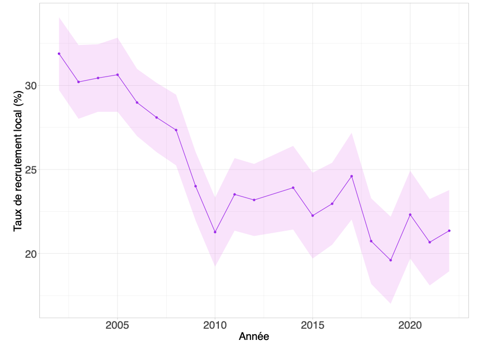 La proportion de locales recrutées parmi les maîtresses de conférences se réduit d’abord à un rythme modéré de 2002 à 2008, passant de 32 à 27 %, et elle est suivie par une baisse plus prononcée et significative entre 2008 et 2010, de 27 à 21 % [43]. Même si la baisse du taux de recrutement local était déjà en cours, il est fort plausible que celle-ci ait été accélérée par la réforme de 2008 qui porte la part des membres externes d’un tiers à la moitié au sein des nouveaux comités de sélection. En revanche, après 2010, la tendance à la baisse des années 2000 s’interrompt. Le taux de recrutement local se stabilise entre 22 et 24 % entre 2010 et 2017, baisse quelque peu en 2018 pour osciller entre 20 et 22 %.