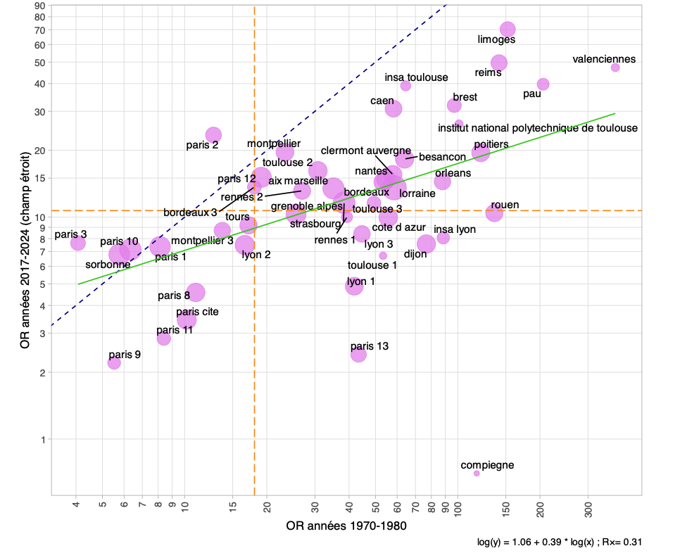 La figure 5 réplique le même exercice pour les établissements universitaires. Elle permet de repérer, sous les mêmes hypothèses de comparabilité, quatre universités au sein desquelles l’indicateur de localisme a augmenté : la Sorbonne (regroupement de Paris 4 et Paris 6), Paris 10 (Nanterre), et ce de manière très modérée, et Paris 3 (Sorbonne Nouvelle) et Paris 2 (Panthéon-Assas), pour lesquelles la hausse est plus marquée. Dans ce dernier cas, la plus localiste des universités parisiennes a ainsi vu son OR doubler (passant de 13 à 24). Le localisme a baissé dans les autres universités, et ce particulièrement fortement à Paris 9 (Dauphine), Paris 11 (Orsay), Paris Cité (Paris 5 et 7), Lyon 1, Toulouse 1, Dijon, Rouen, Paris 13, ou de manière plus spectaculaire encore au sein de l’université technologique de Compiègne. Celle-ci était fortement localiste dans les années 1970-1980 avec un OR de 117 et devient résolument antilocaliste avec un OR de 0 au cours des années récentes.