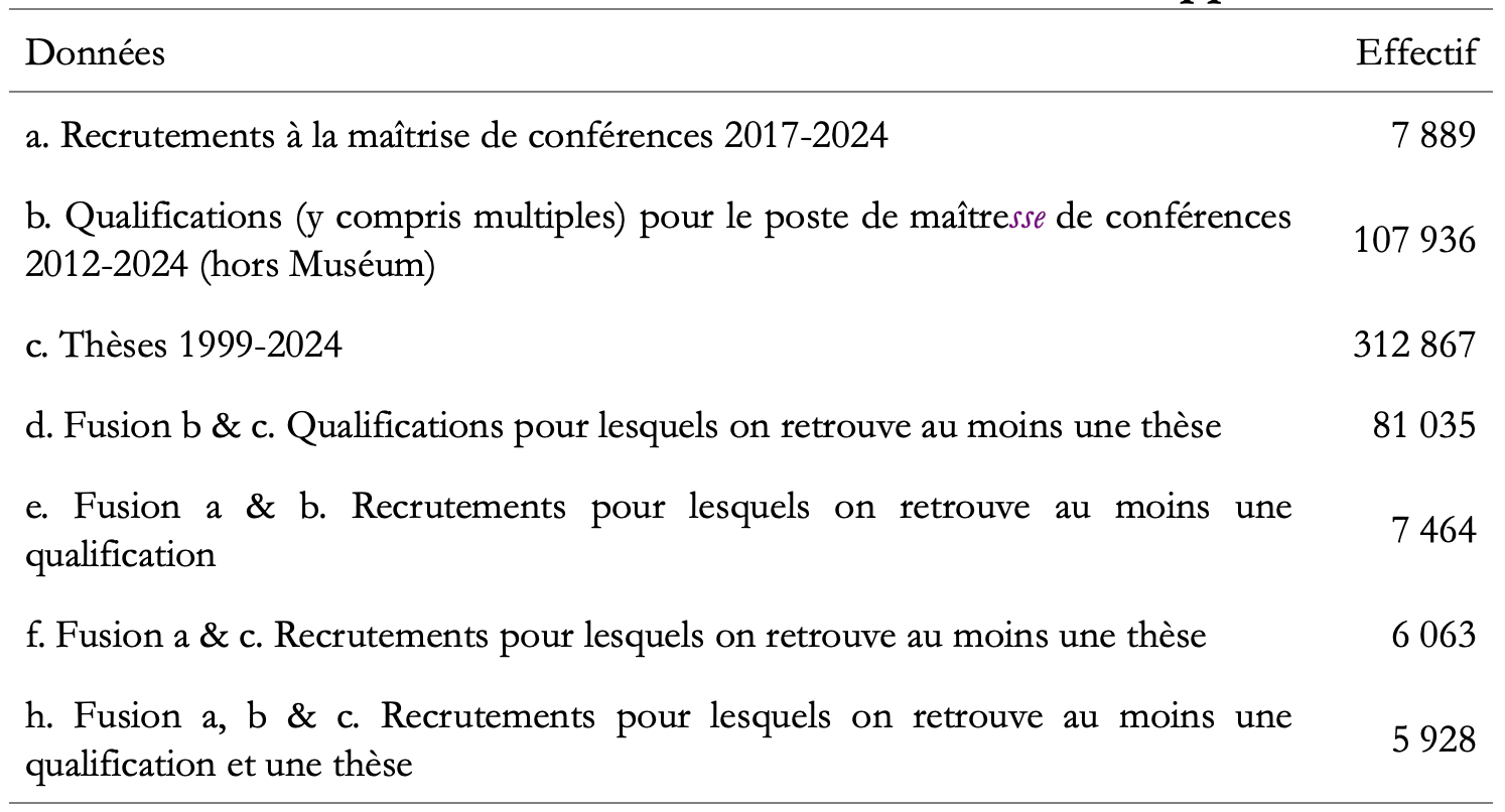 De la même façon, on retrouve au moins une qualification pour 7 464 des 7 889 maîtresses de conférences recrutées. Le taux de 5 % de non-appariement doit en partie au fait que, dans certains cas, il est possible d’être dispensé de la qualification pour concourir (personnes en poste en France ou à l’étranger dans un poste de niveau maîtrise de conférences ou équivalent). Des inconsistances dans l’écriture des noms-prénoms et/ou de nos bases de données collectées peuvent aussi jouer un rôle. Enfin, lorsque l’on combine les trois sources, on compte 5 928 recrutements pour lesquels on retrouve à la fois une qualification et une thèse.