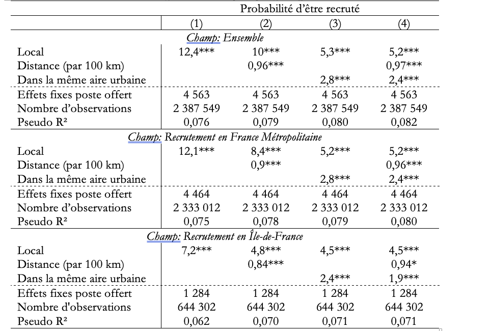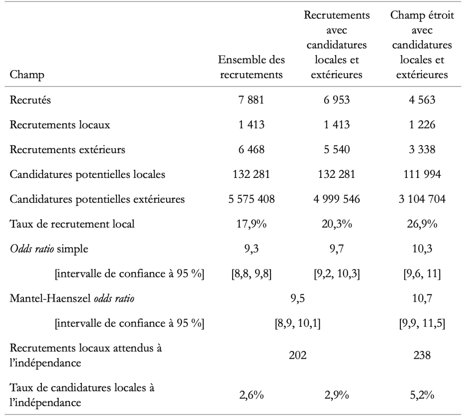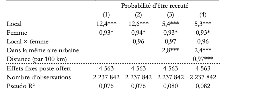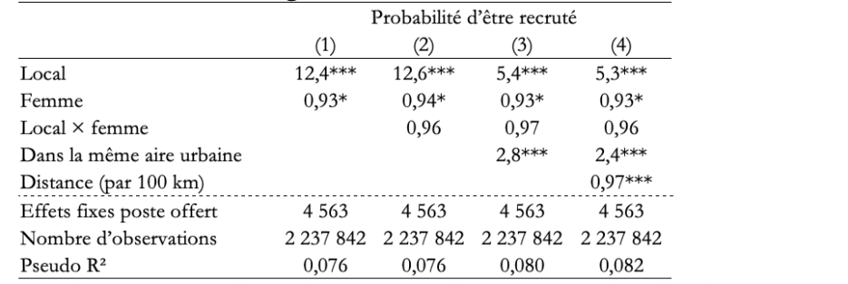 Il n’en reste pas moins que, même en tenant compte de la distance et l’appartenance à la même aire urbaine, être la candidate locale favorise fortement les chances d’être recrutée. Les candidates locales ont quand même 5,2 fois plus de chances dans l’ensemble et 4,5 fois plus de chances lors des recrutements en Île-de-France que les candidates extérieures d’être recrutées.