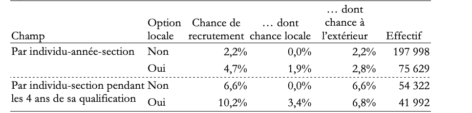Sur les quatre ans de qualification, l’écart diminue, mais reste substantiel. Seules 44 % des candidates ont la chance de bénéficier au moins une fois d’une option de recrutement local pendant les quatre années, ce qui leur permet d’avoir 10,2 % de chances d’être recrutées. Celles qui ne bénéficient pas de l’option locale ont seulement 6,6 % de chance de l’être pendant la durée de la qualification.