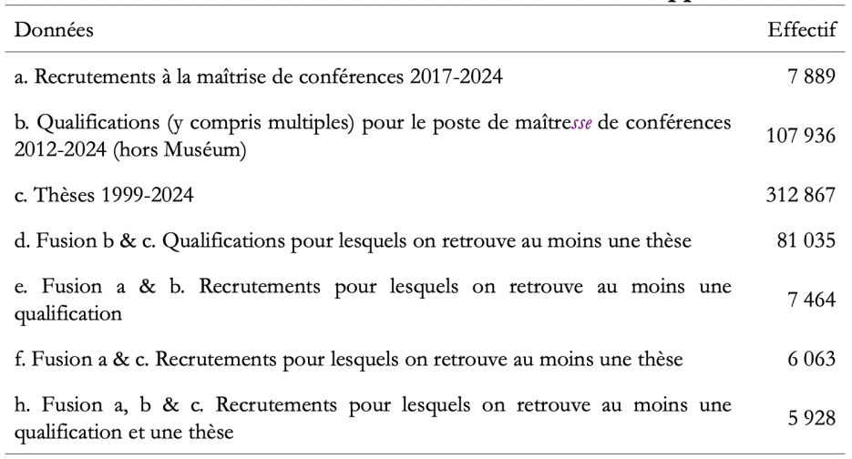 Si, lors de la parution de notre article de 2008, on pouvait nous reprocher l’utilisation de données approximatives et fragiles dont l’exploitation reposait sur de nombreuses hypothèses [35], l’utilisation de ces nouvelles sources nous offre la possibilité de suivre précisément la transition entre le doctorat et le recrutement à la maîtrise de conférences.