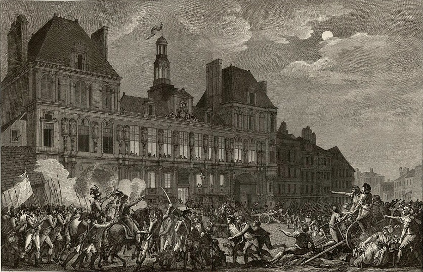 L’attaque de l’Hôtel-de-Ville par les troupes de la Convention, le 9 thermidor an II (26 juillet 1794). Dessin de Charles Monnet, gravé par Duplessis-Bertaux et Helman, 1799.