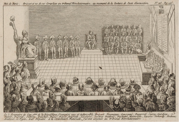 Source : BNF, RESERVEFOL-QB-201 (132), Brissot et 20 de ses complices au tribunal révolutionnaire, au moment de la lecture de l’acte d’accusation, anonyme, 1793.